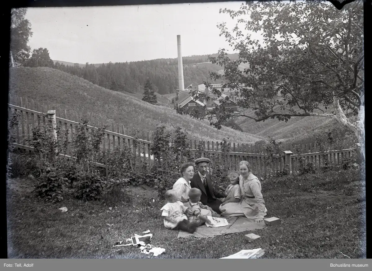 En familj sittandes på en filt i en trädgård.