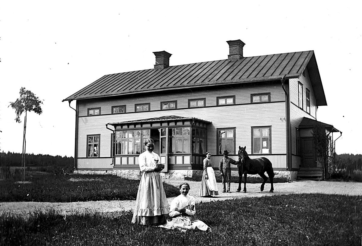 Gunnar Nilssons hus i Nyhyttan, Torsåker. På gården två flickor, en man, en kvinna samt en häst.