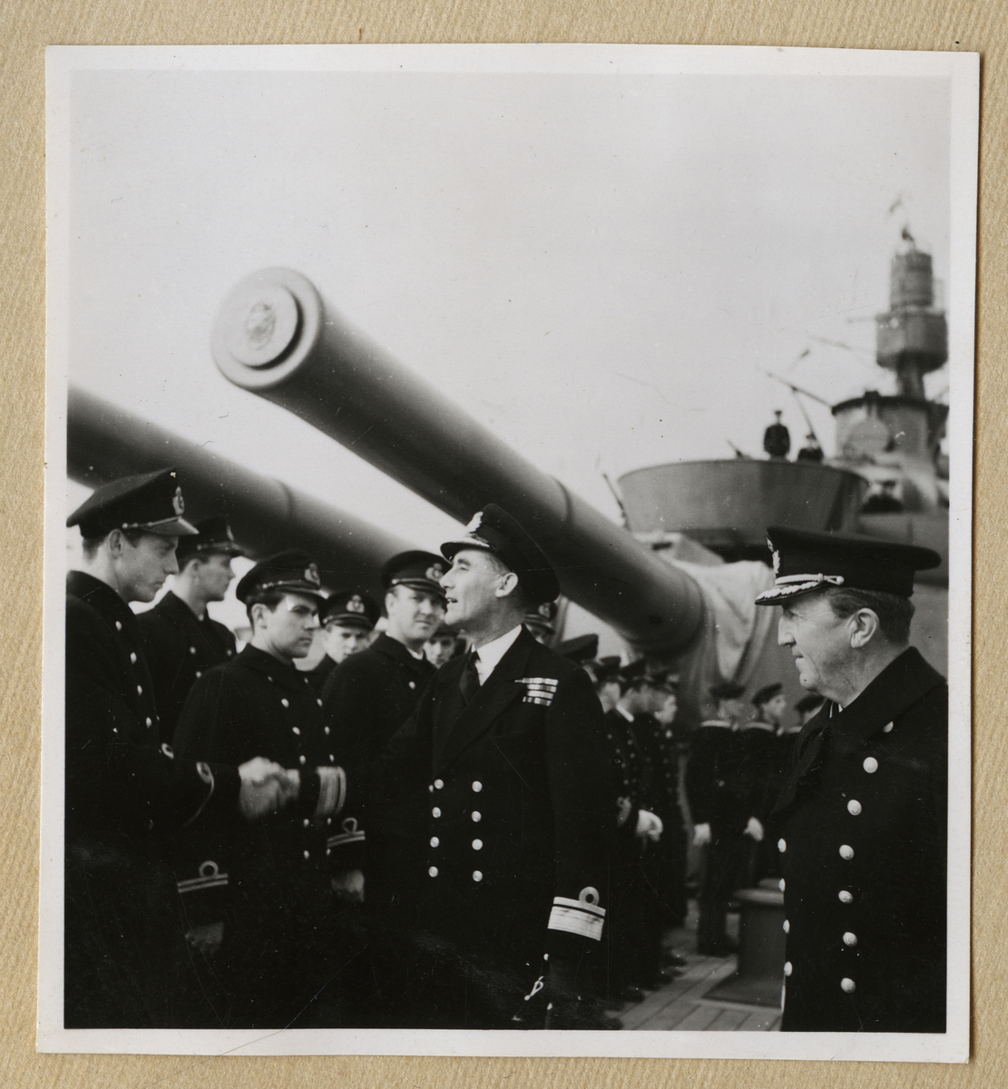 Engelska och svenska sjöofficerare skakar händerna under pansarskepp Sveriges kanoner.