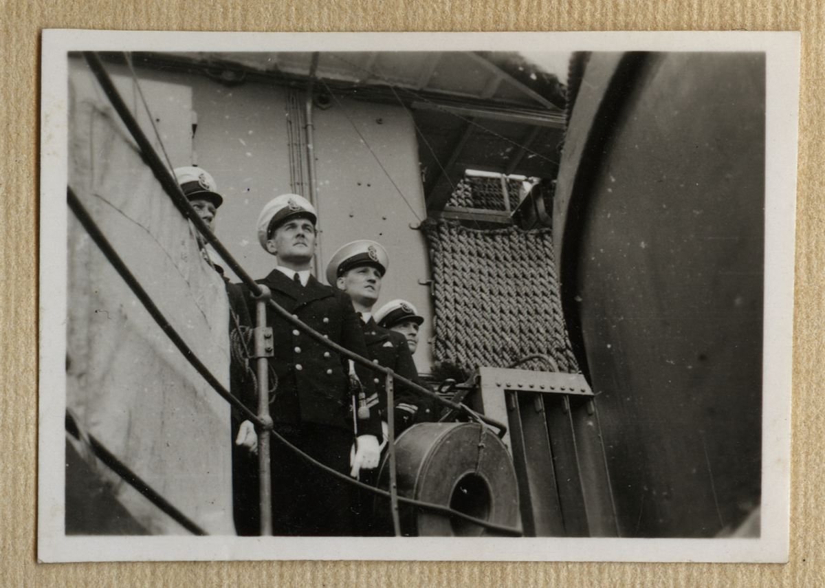 Manskapet och befäl av pansarskepp Sverige har tagit uppställning på däck för att hälsar konungen.