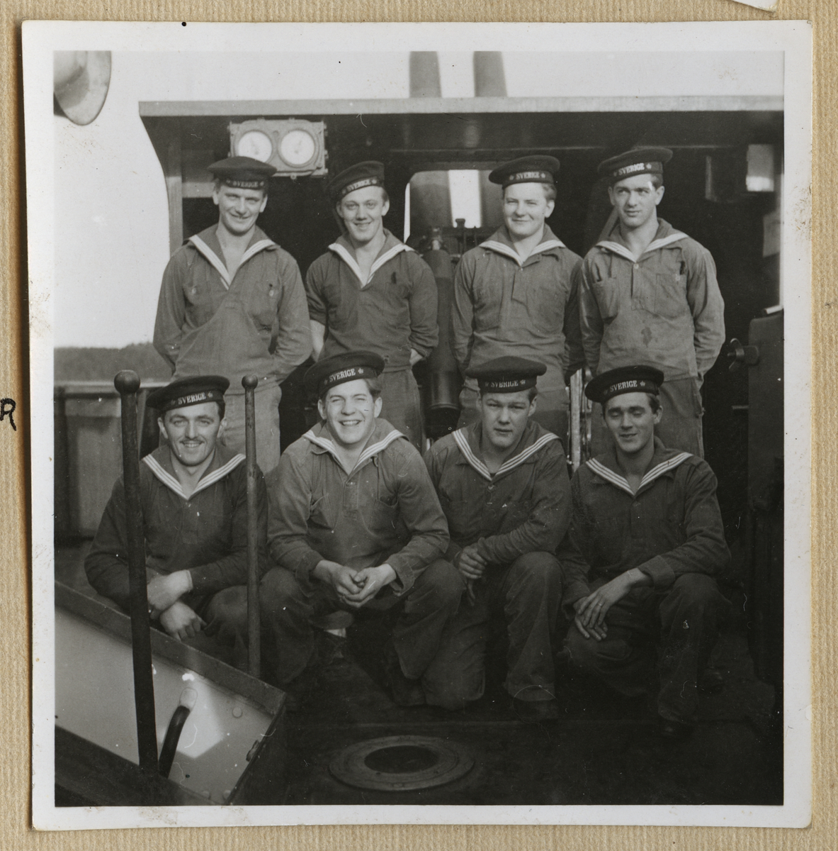 Åtta stycken ekonomister har tagit uppställning för ett gruppfoto ombord på pansarskepp Sverige.