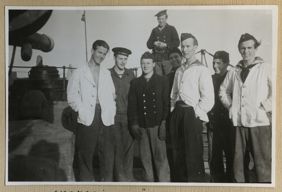 Ekonomi- och däckspersonal från pansarskepp Sverige har tagit uppställning på däck.