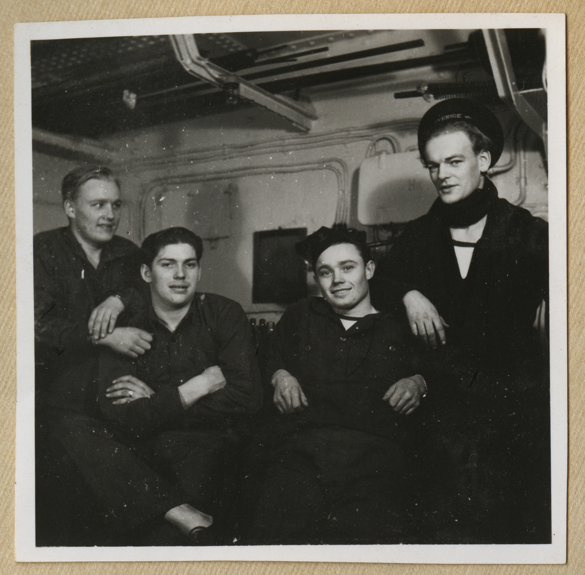 Bilden visar fyra unga män i arbetskläder på pansarskepp Sverige.