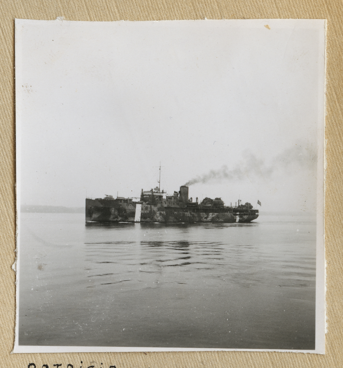 Bilden visar ubåtsdepåtfartyg Patricia med maskeringsmålning och neutralitetstecken.