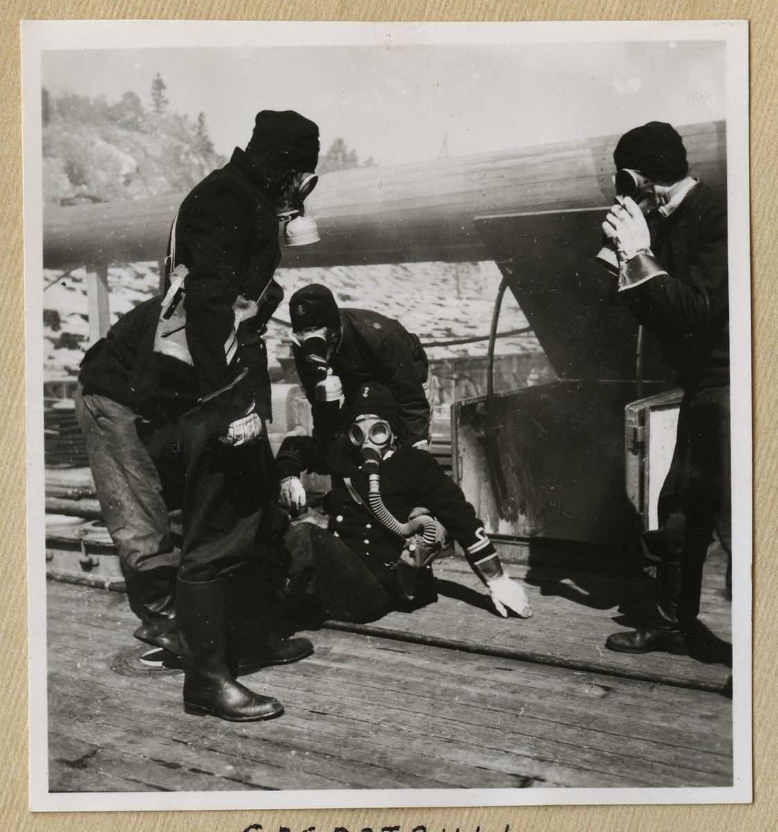 Bilden visar soldater som tränar med gasmasker ombord på ett örlogsfartyg.