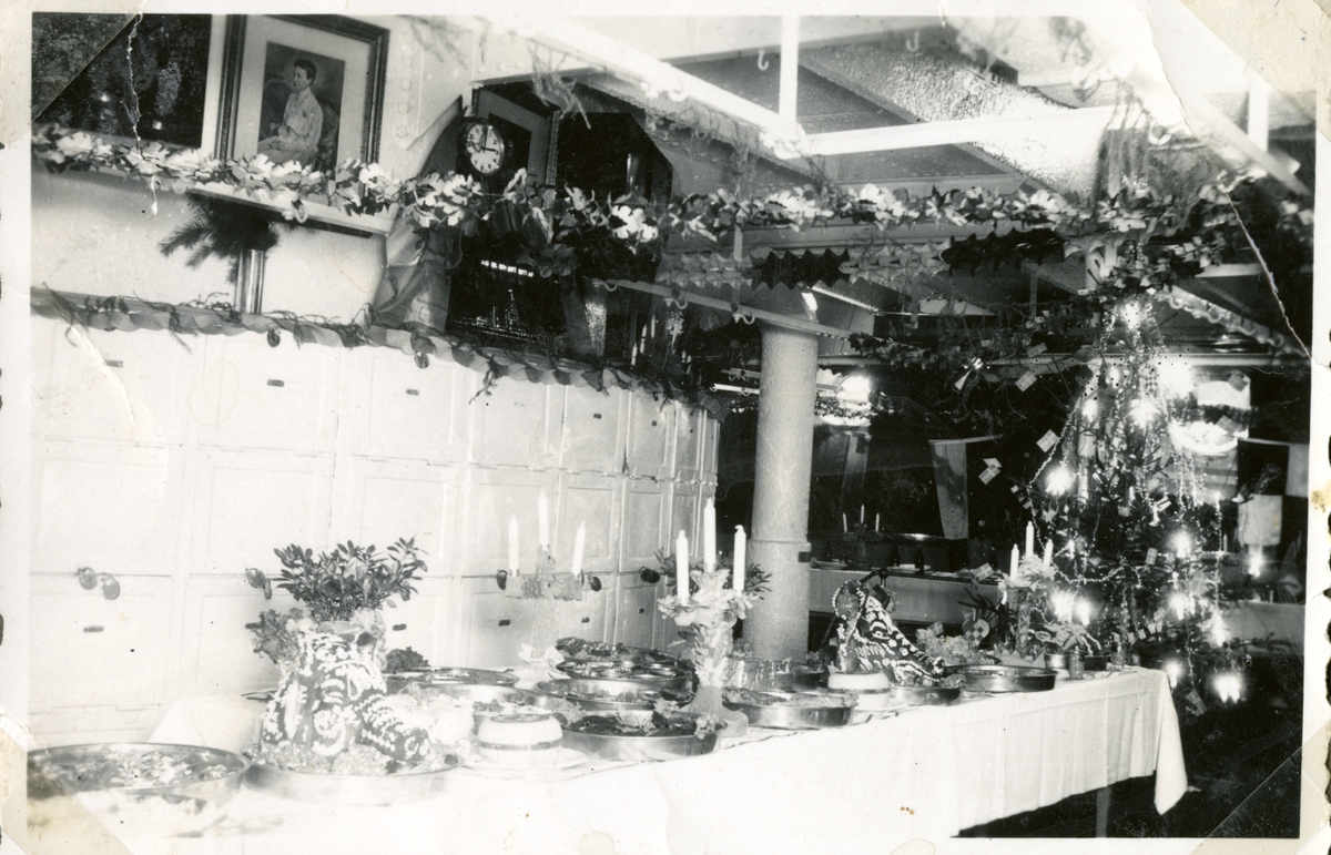 Bilden visar ett festlig dukat buffé ombord på pansarfartyget Drottning Victoria. På väggen syns ett porträtt av drottningen. Bufféers höjdpunkt verka vara två festlig dekorerade grishuvuden.