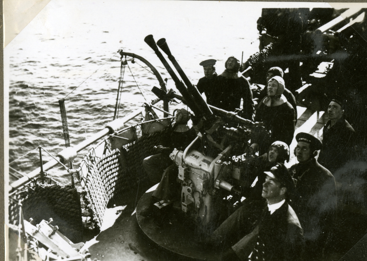 Bilden visar en grupp militärer som står runt ett luftvärnskanon och kikar på himmelen.