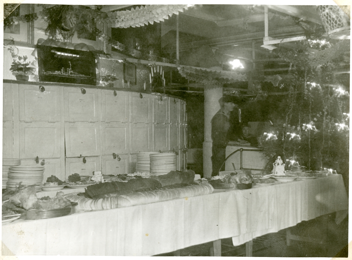 Bilden visar en matbuffé för jul-och nyårsfirande ombord på pansarskepp Drottning Victoria. På väggen hänger en nattfotografi av fartyget med en julhälsning.