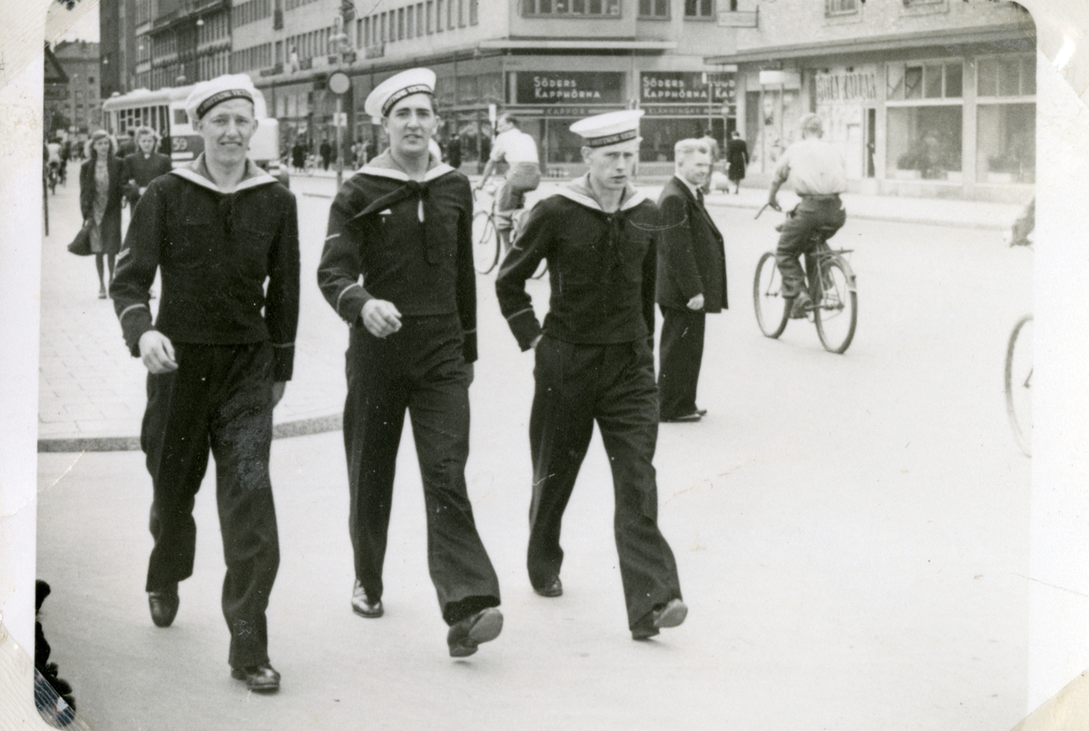 Bilden visar tr sjömän i sjömanskläder som går på Götgatan i Stockholm. I bakgrunden syns affären Söders Kapphörna.