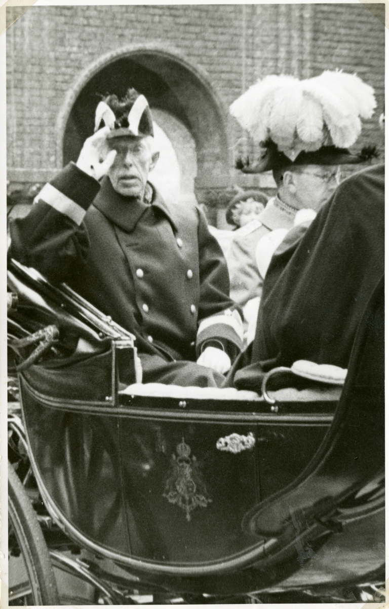 Bilden visar kung Gustav V. som sitter i en hästvagn och hälsar.