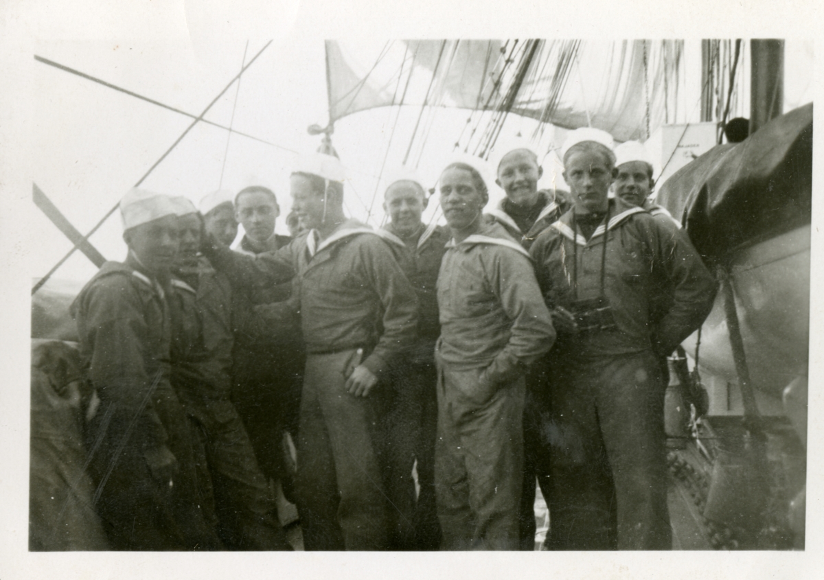 Bilden visar en grupp skeppsgossar ombord på skeppsgossefartyget Jarramas. Pojken till höger har en fotokamera.