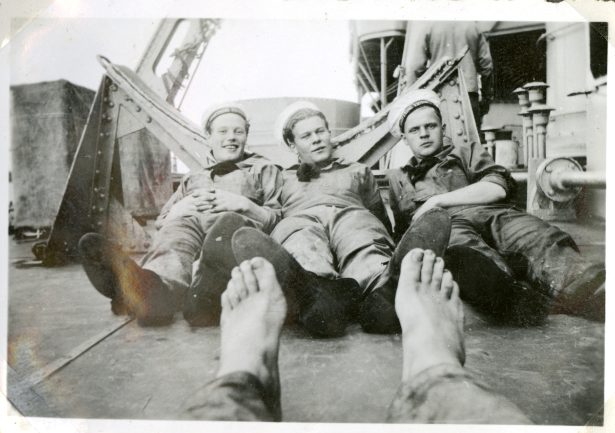 Bilden visar tre sjömän som ligger på däcket av pansarskeppet Drottning Victoria.