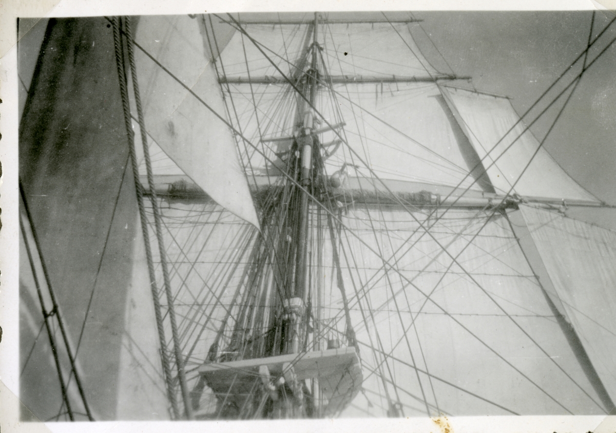Bilden visar en mast med satta segel på skeppsgossefartyget Jarramas.
