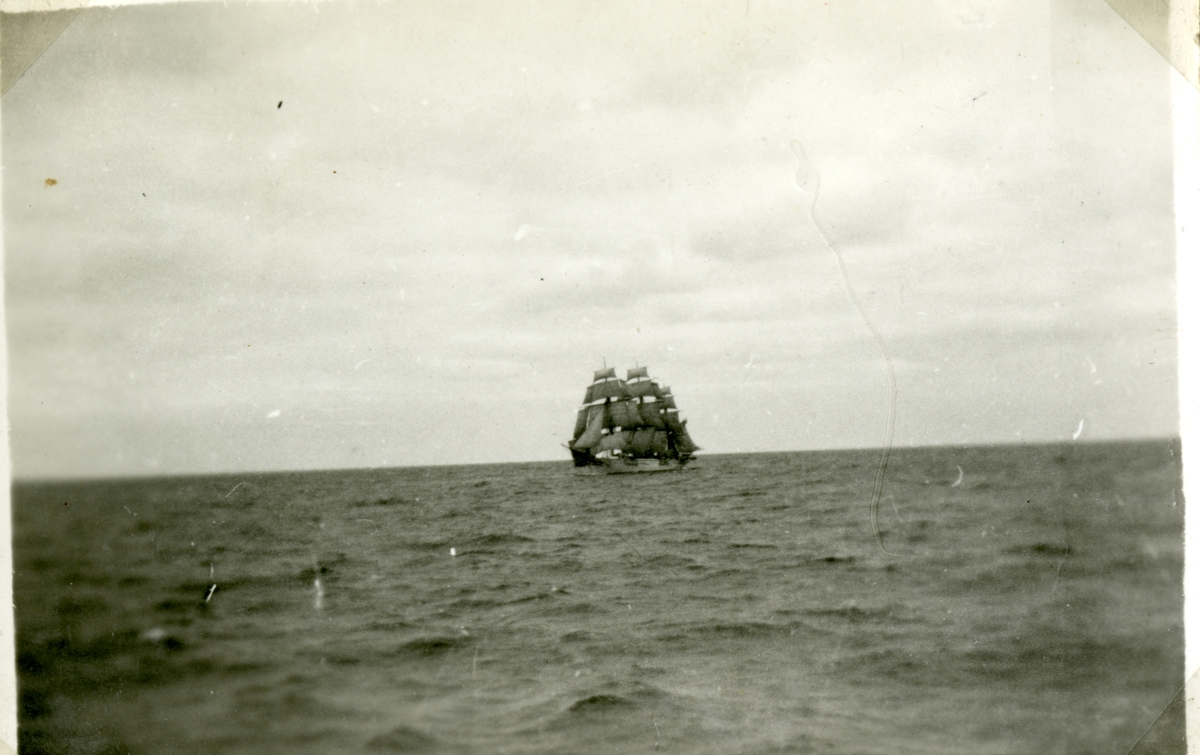 Titel: Bilden visar skeppsgossefartyget Jarramas med satta segel till sjöss från babordssida.
