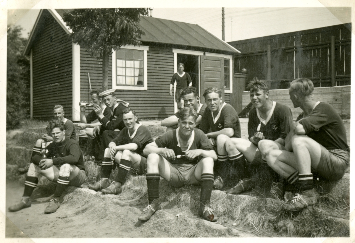 Bilden visar en idrottslag med skeppsgossar från Jarramas tar en paus.