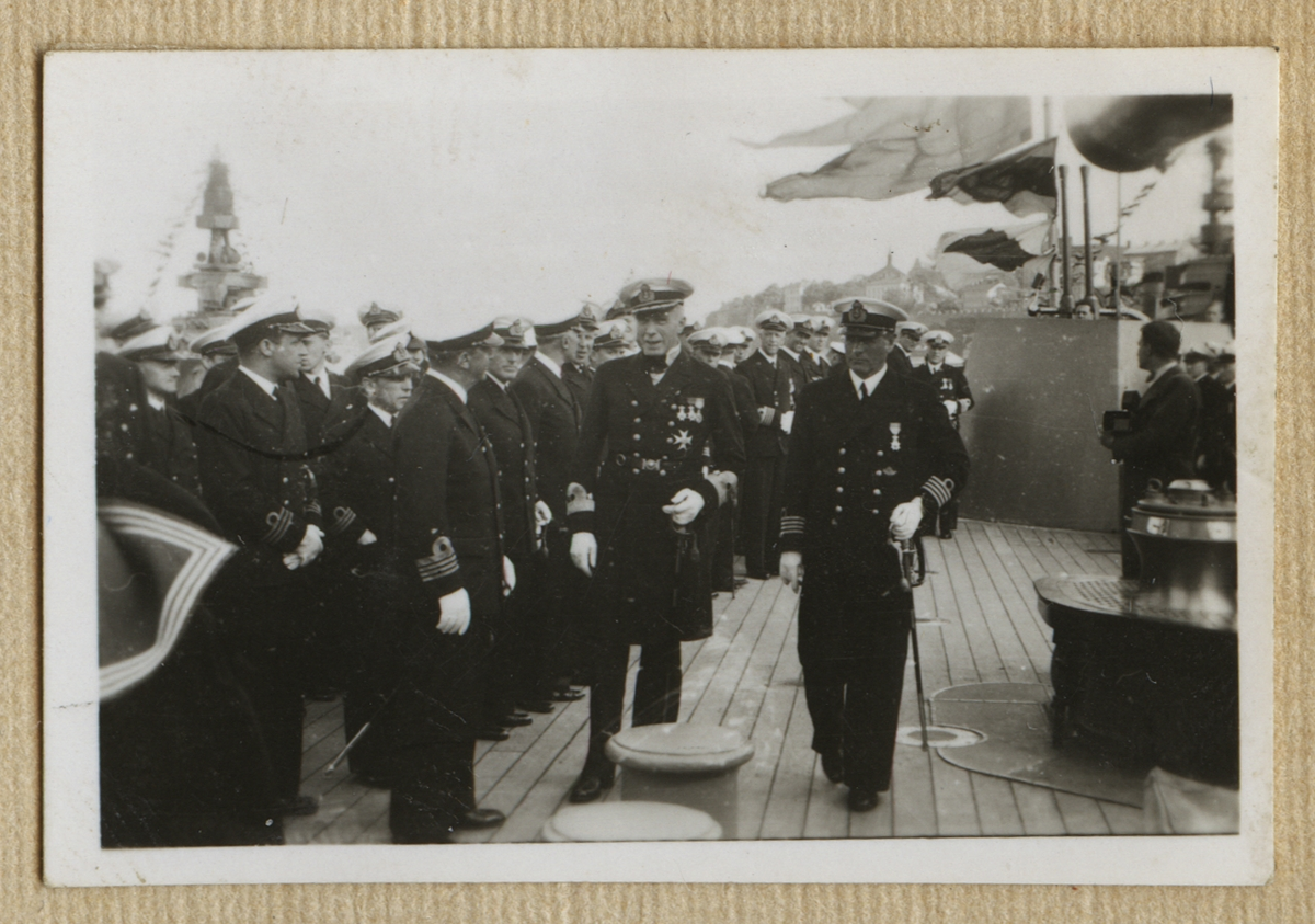 Bilden visar en amiral som går förbi sjöofficerare som har tagit uppställning ombord på pansarskeppet Sverige under besöket av kung Gustav V.