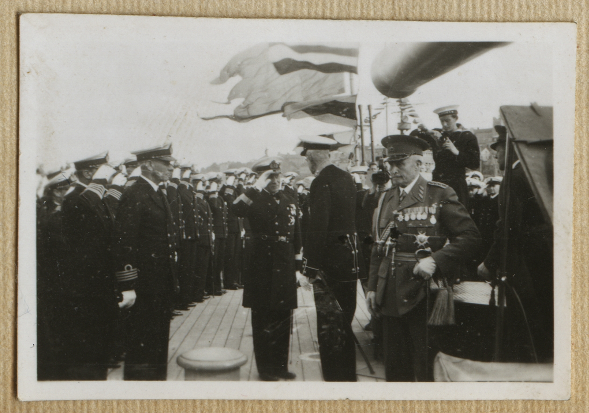 Bilden visar en amiral och sjöofficerare som har tagit uppställning ombord på pansarskeppet Sverige och hälsar kung Gustav V. I bakgrunden syns ett flertal fotografer som dokumenterar händelsen. I förgrund står en general med många ordnar och medaljer.