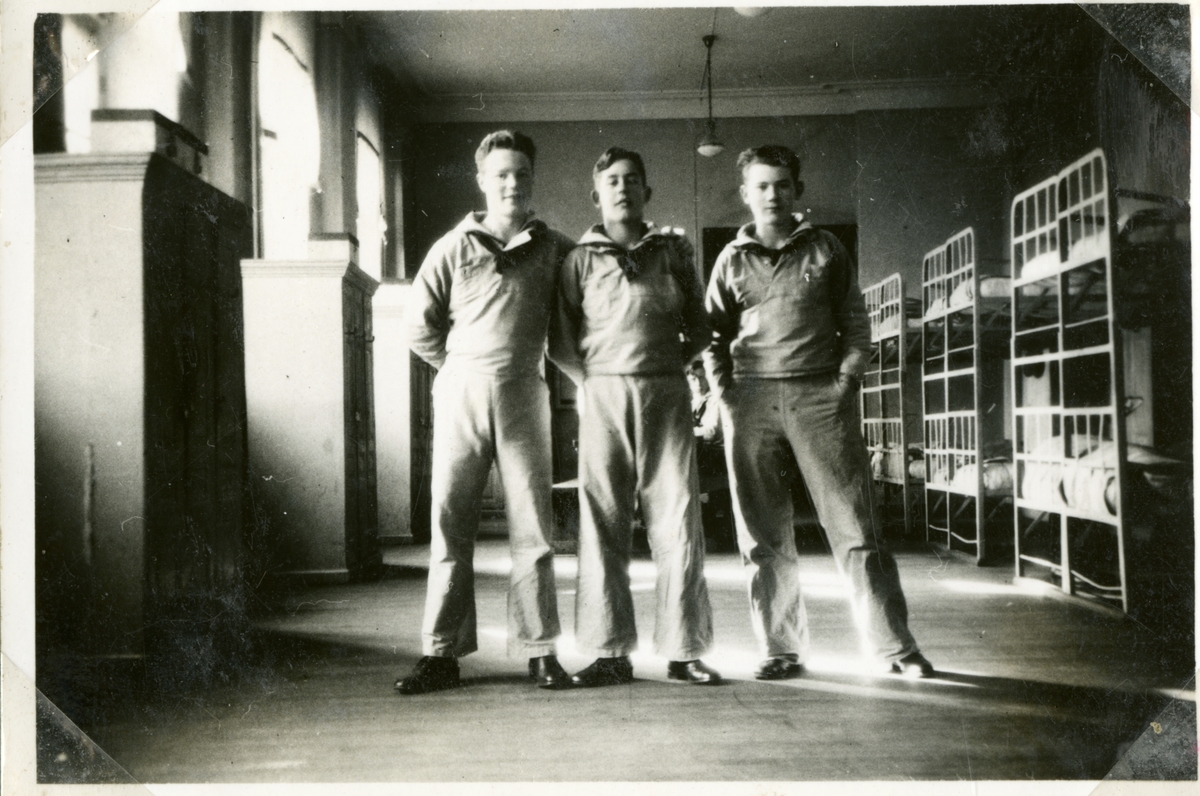 Tre skeppsgossar låter sig poträttfotografera i sovsalen. På höger sida syns våningssängar.