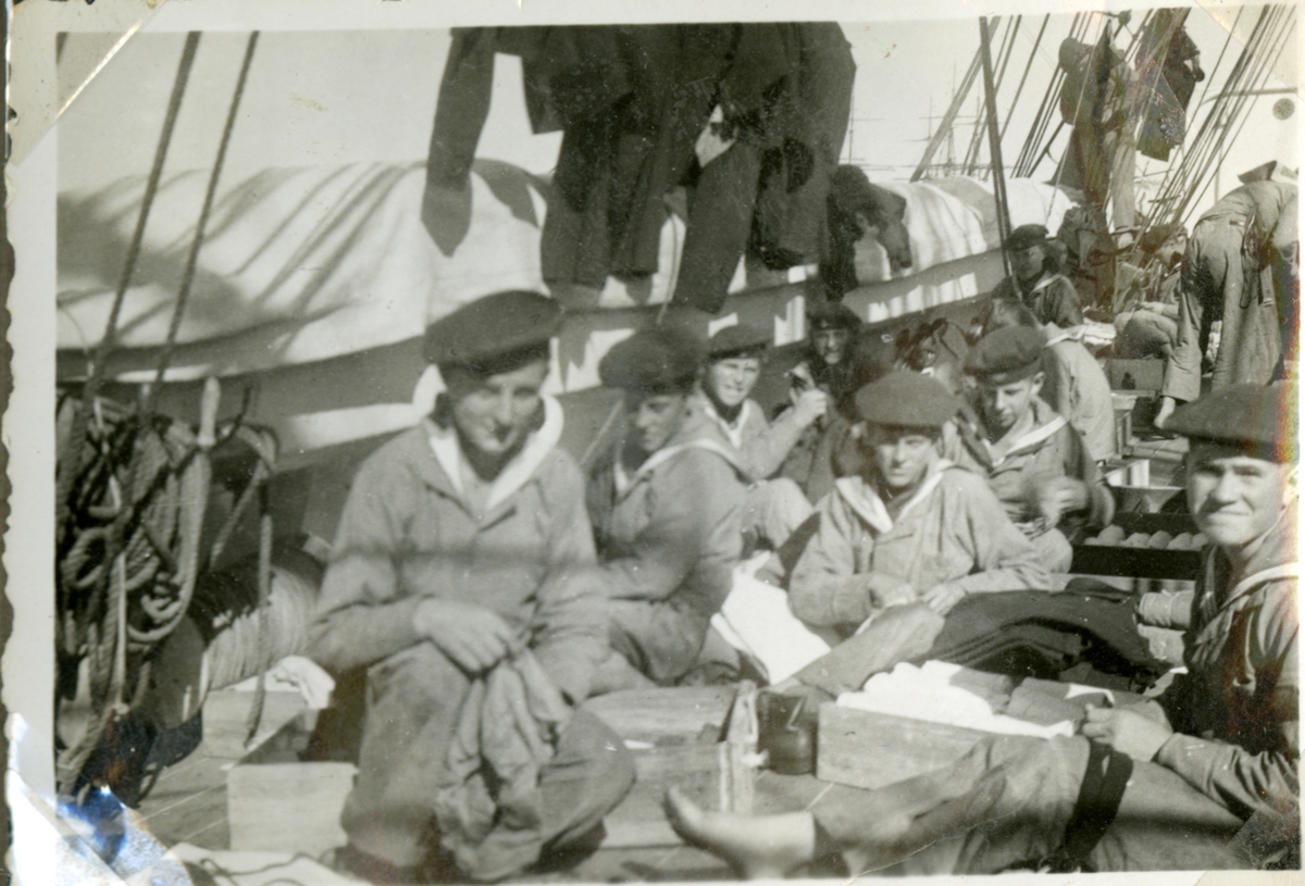 Bilden visar skeppsgossar som vårdar sina kläder och annan utrustning ombord på Jarramas.