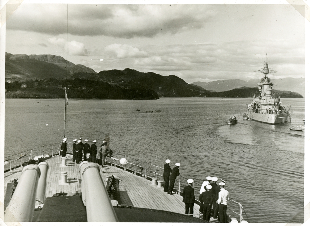 Bilden föreställer en vy från pansarskepp Drottning Victoria mot kusten och ett annat örlogsfartyg. Runt fartygen och mellan kusten pågår en livlig trafik med småbåtar.