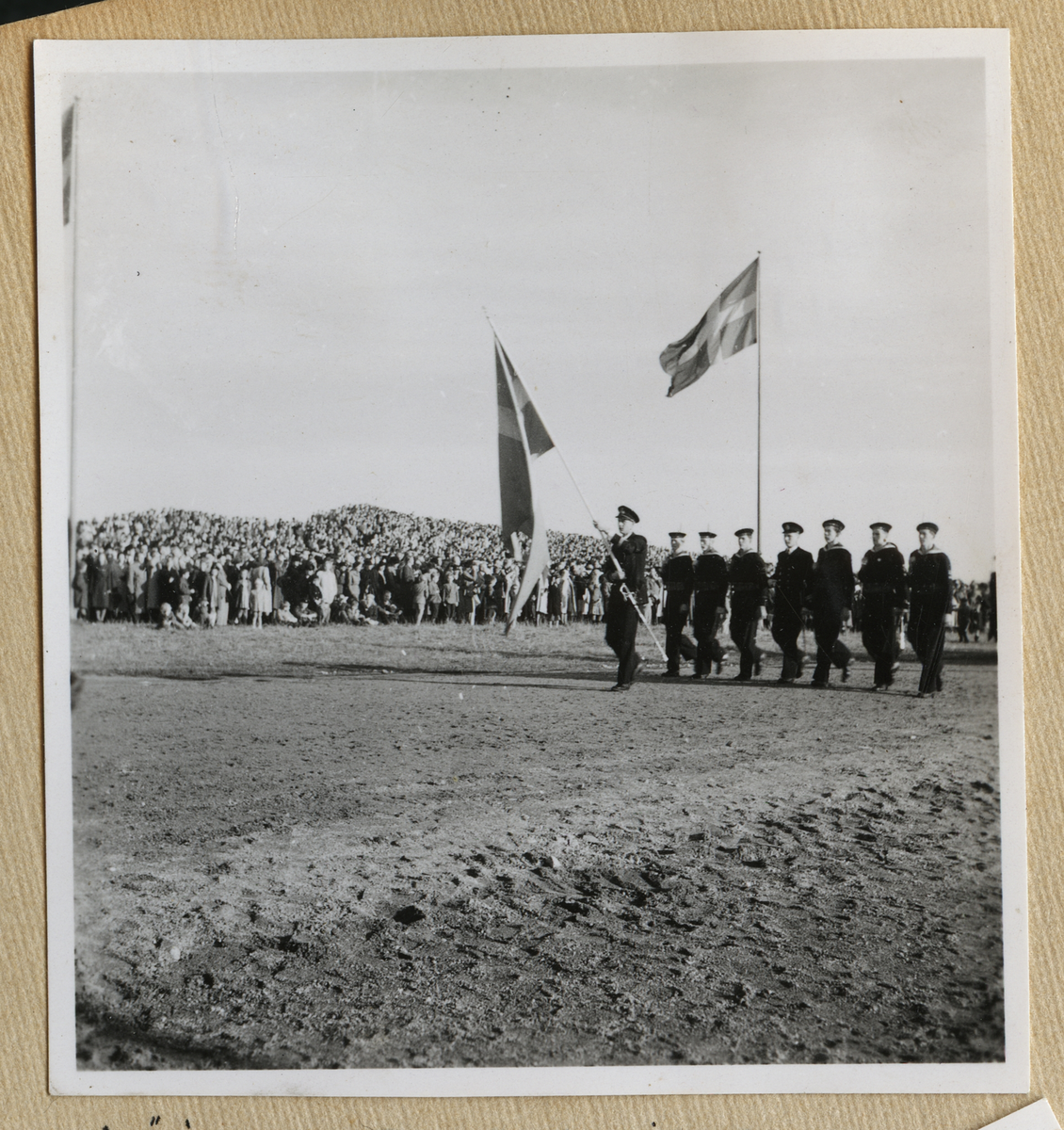 Löjtnant Per Lindblom för svenska örlogsflaggan förbi kungliga läktaren. I bakgrunden syns folkmängden som har samlats för att följer ceremonin.