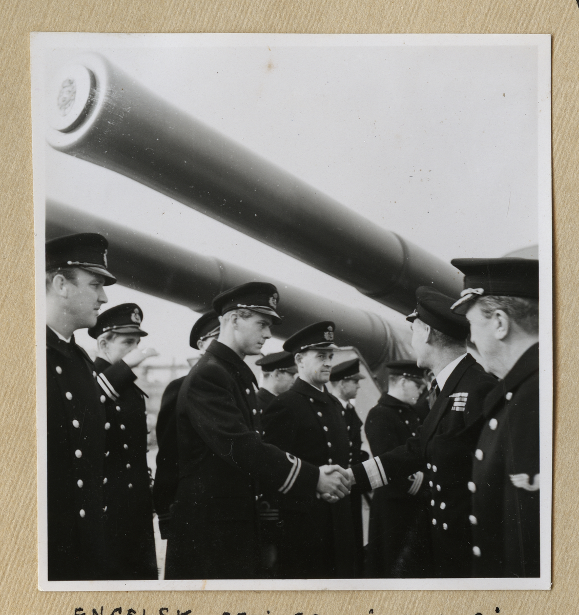 Engelska och svenska sjöofficerare skakar händerna under pansarskepp Sveriges kanoner.