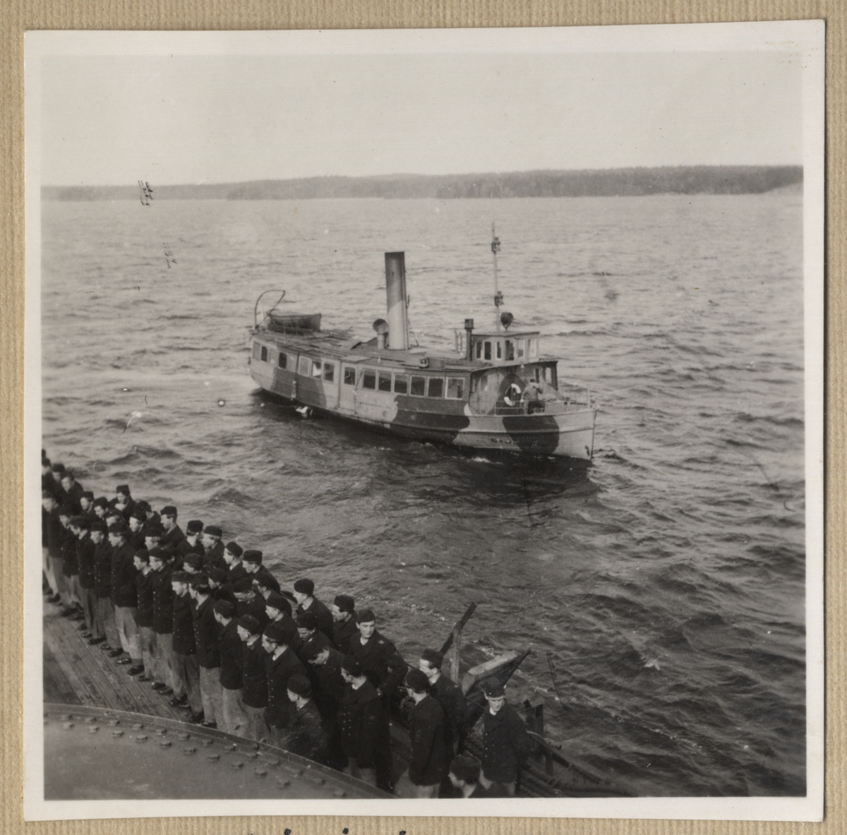 Bilden visar manskapet som har tagit uppställning ombord på ett örlogsfartyg. I bakgrunden passerar en ångbarkass med maskeringsmålning.