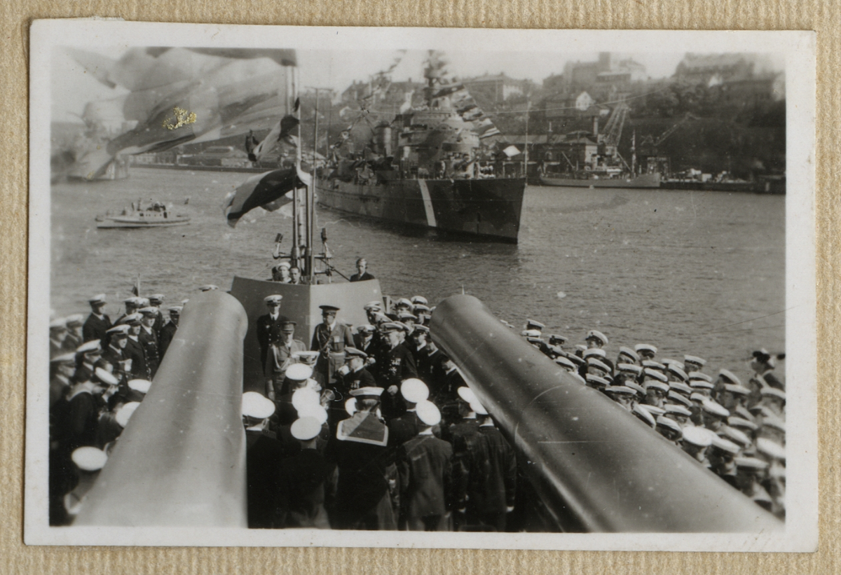 Kung Gustav V hälsar manskapet som har tagit uppställning ombord på pansarskepp Sverige. I bakgrunden syns andra höga sjöofficerare.