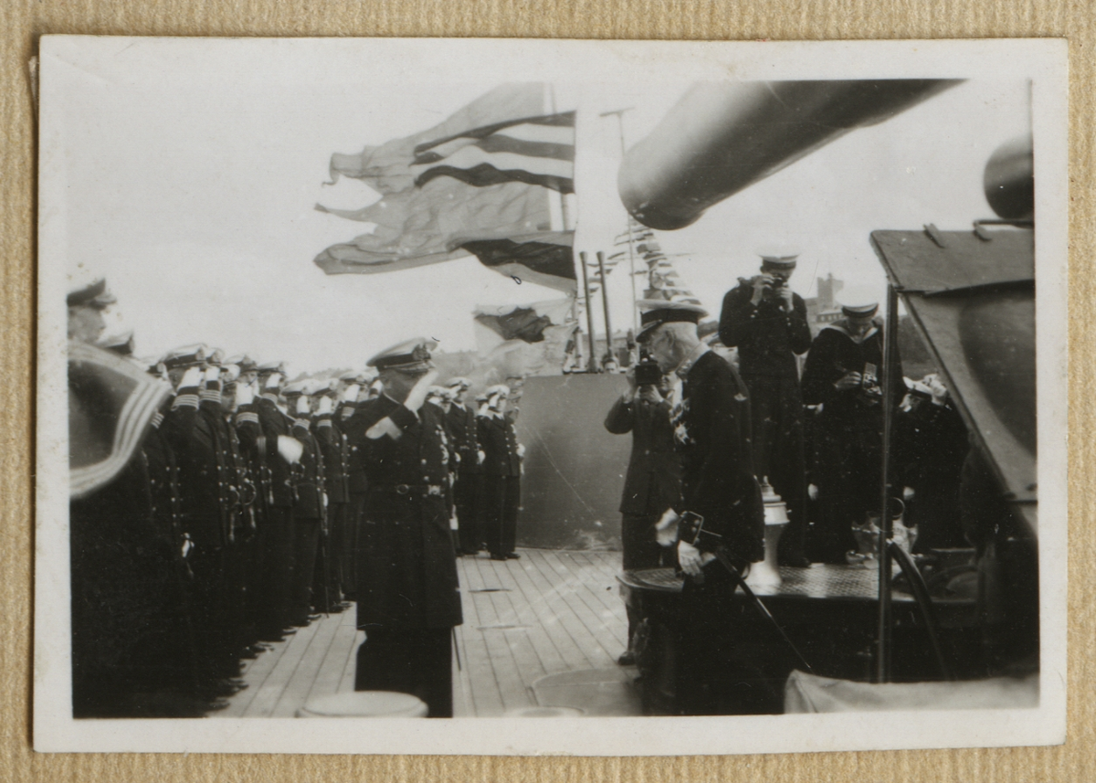 Bilden visar en amiral och sjöofficerare som har tagit uppställning ombord på pansarskeppet Sverige och hälsar kung Gustav V. I bakgrunden syns ett flertal fotografer som dokumenterar händelsen.