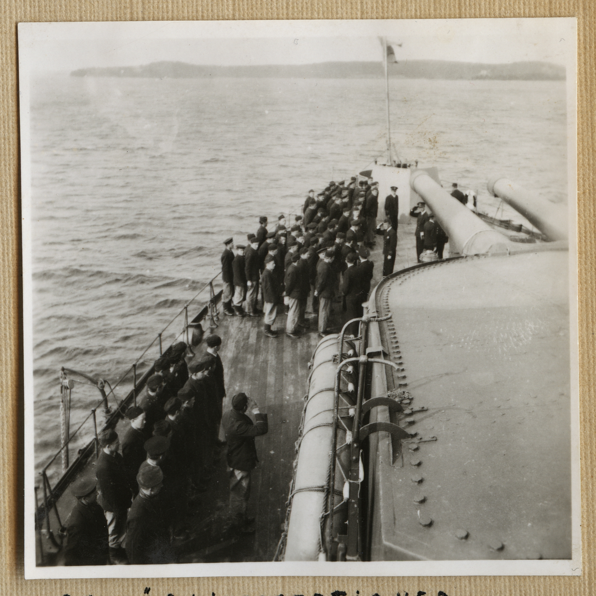 Manskapet på pansarskepp Sverige har tagit uppställning i grupper ombord och hälsar till en befäl.