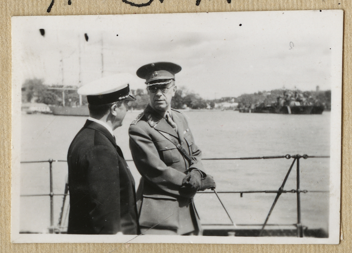 Bilden visar kronprins Gustav i samtal med en befäll ombord på pansarskepp Sverige. I bakgrunden syns Kastellholmen där ett större antal örlogsfartyg ligger förtöjd.