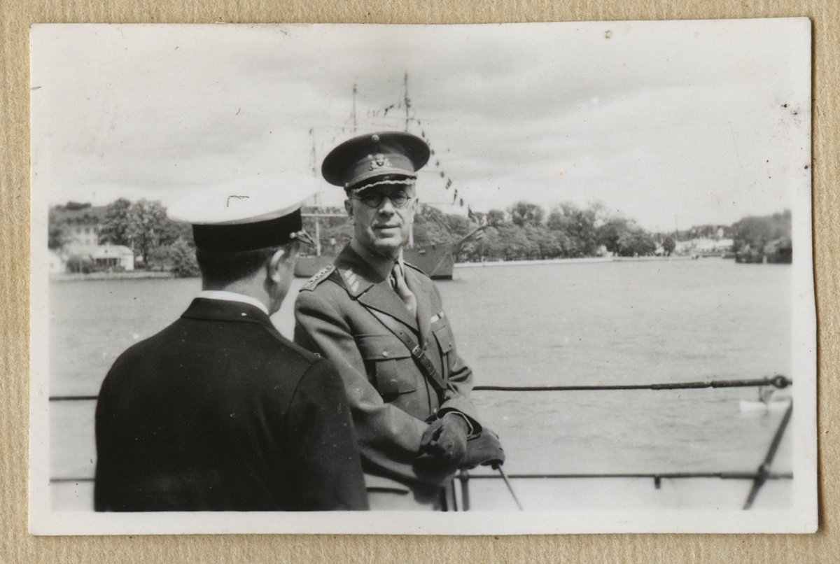 Bilden visar kronprins Gustav i samtal med en sjöofficerare ombord på Sverige. I bakgrunden syns övningsfartyget af Chapman med storflaggning.