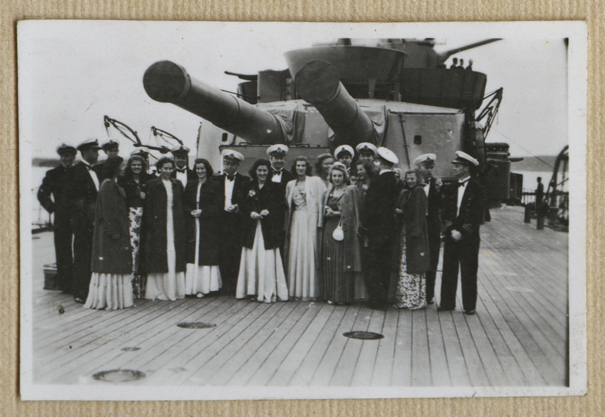 En grupp finklädda damer har tillsammans med landshövdingen och några befäl tagit uppställung för en gruppfoto under en av pansarskeppet Sveriges kanontorn.