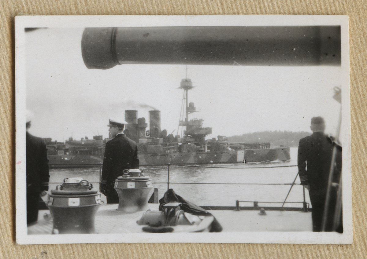 Ett fartyg med neutralitetstecken passerar förbi pansarskeppet Sverige.
