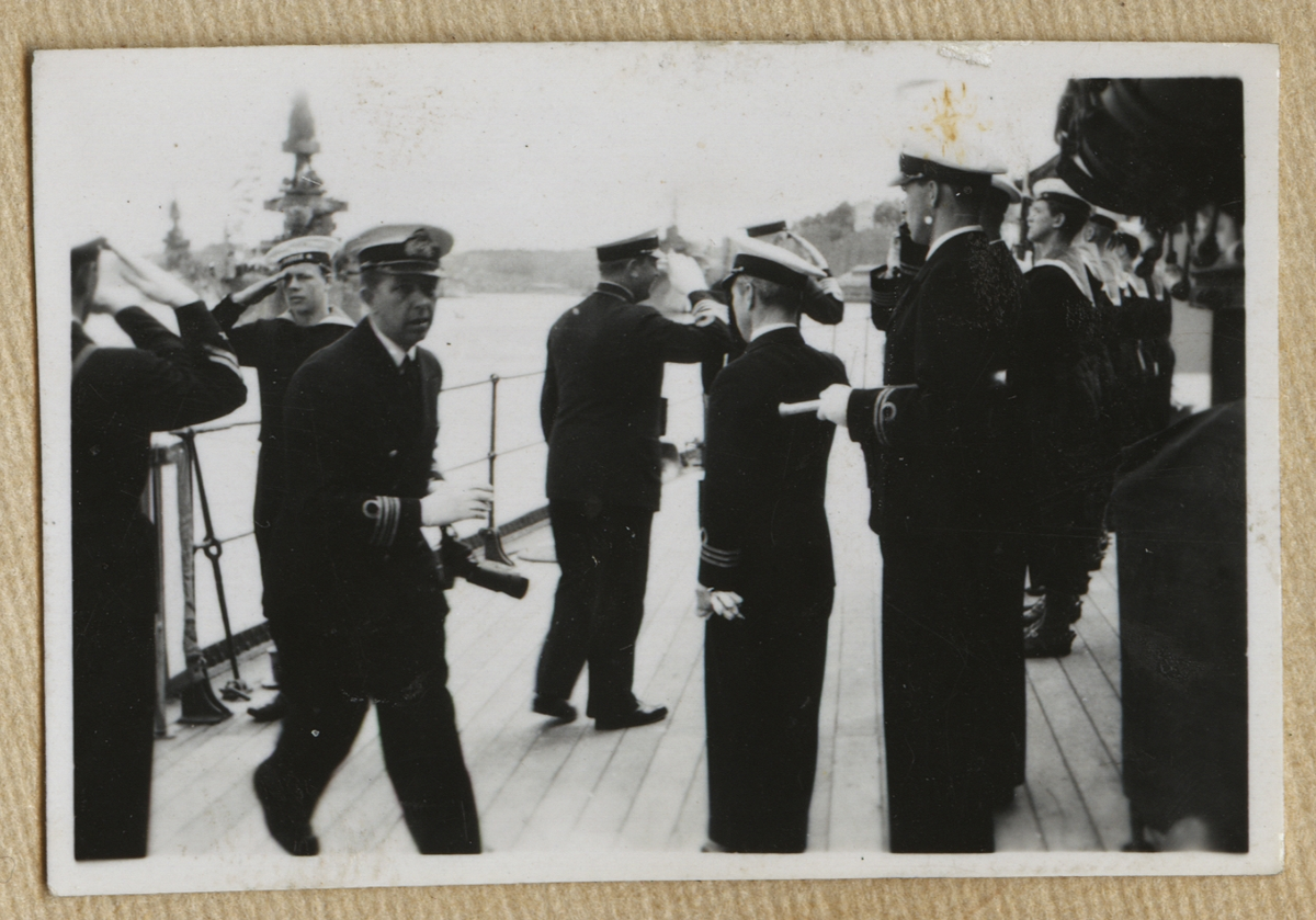 En grupp sjöofficerare hälsas välkommen ombord på pansarskepp Sverige