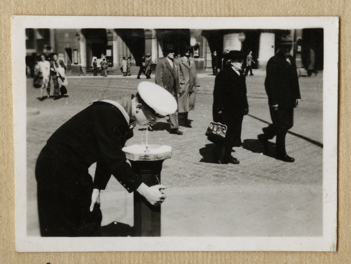 Bilden visar en sjöman på permission i staden. Han dricker vatten ur en brunn.