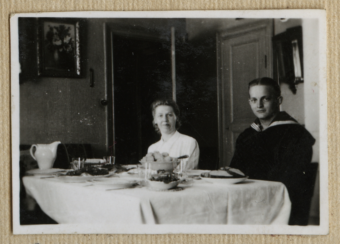 Bilden visar en sjöman med en kvinna som sitter vid ett bord som är festlig dukat för en middag.