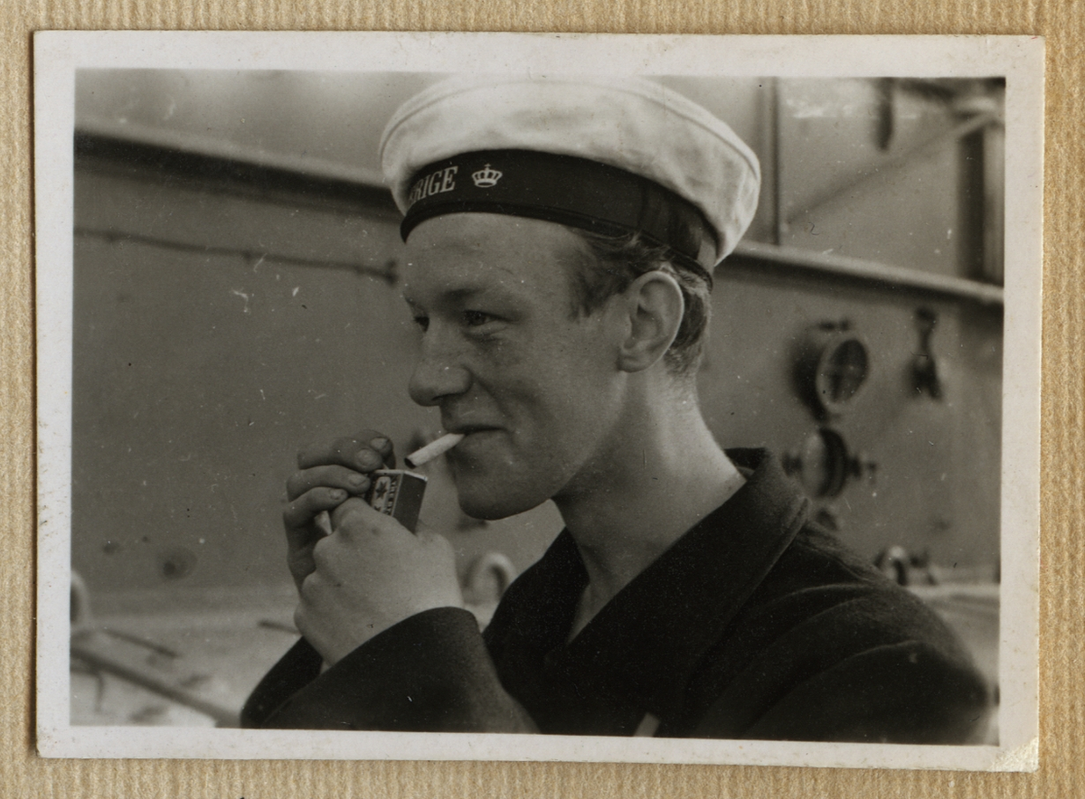 Titel: Bilden visar "Foto-Anders" från pansarskepp Sverige som röker en cigarett.