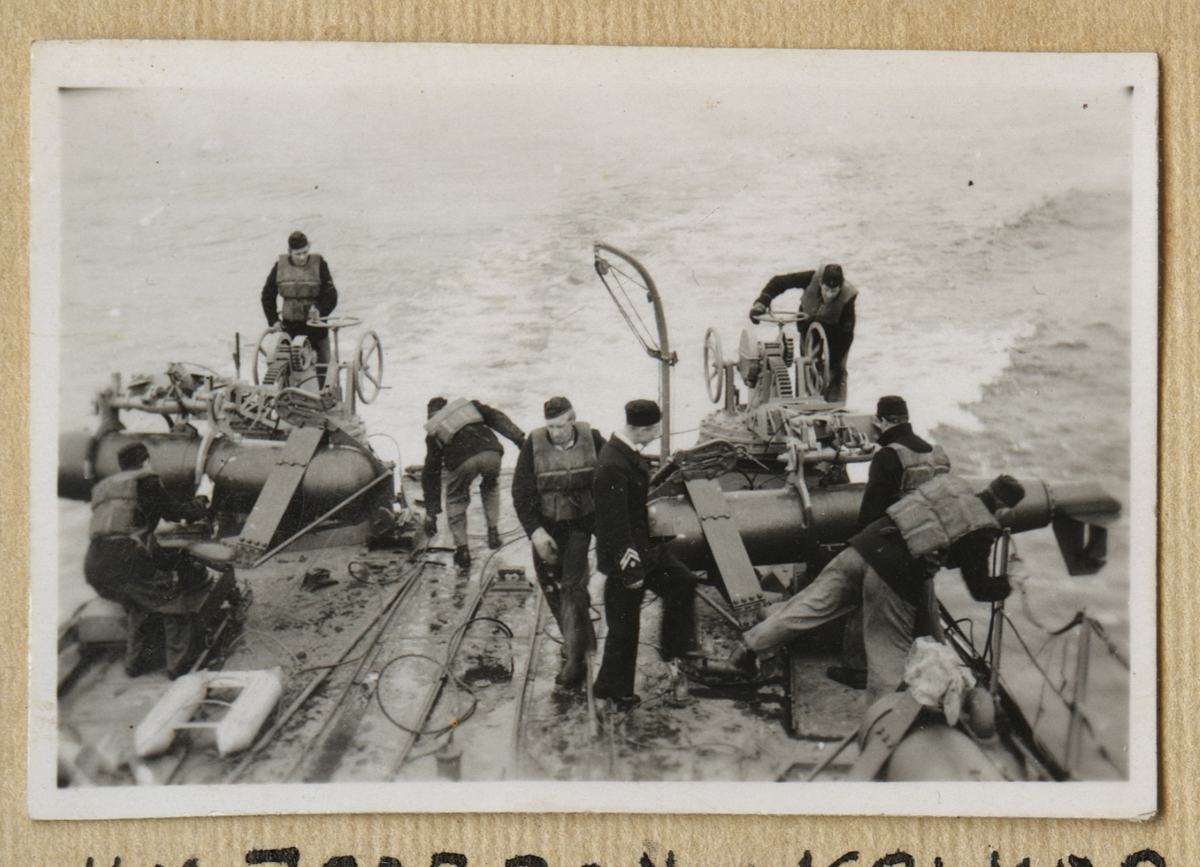Bilden visar en grupp sjömän som arbetar på akterdäcket av jagaren Kalmar med paravaner för minröjning. Alla bär flytvästar.