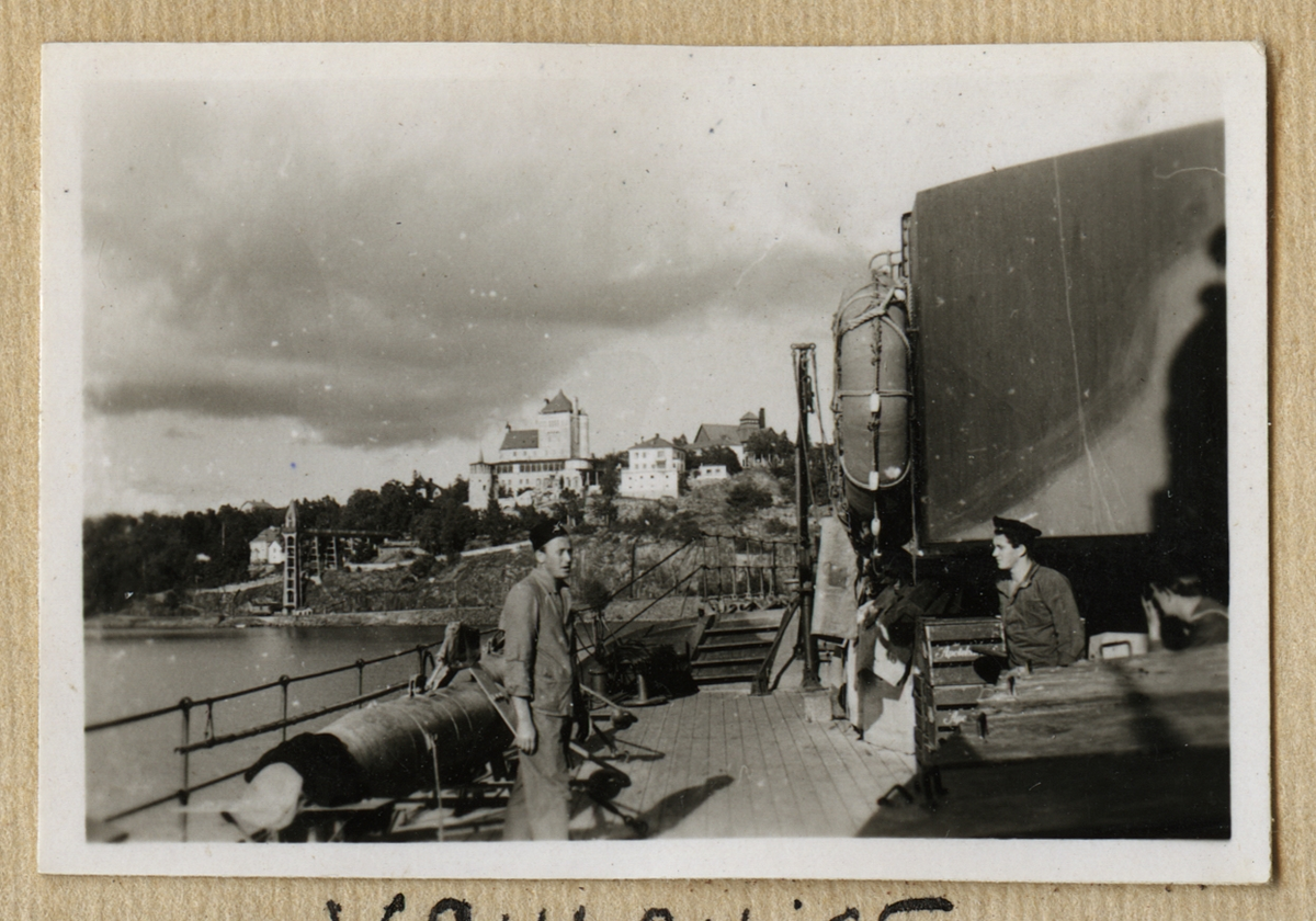 Bilden visar två glada sjömän ombord på pansarskeppet Sverige. Fartyget ligger till ankars vid Lidingö. I bakgrunden syn hotell Foresta.