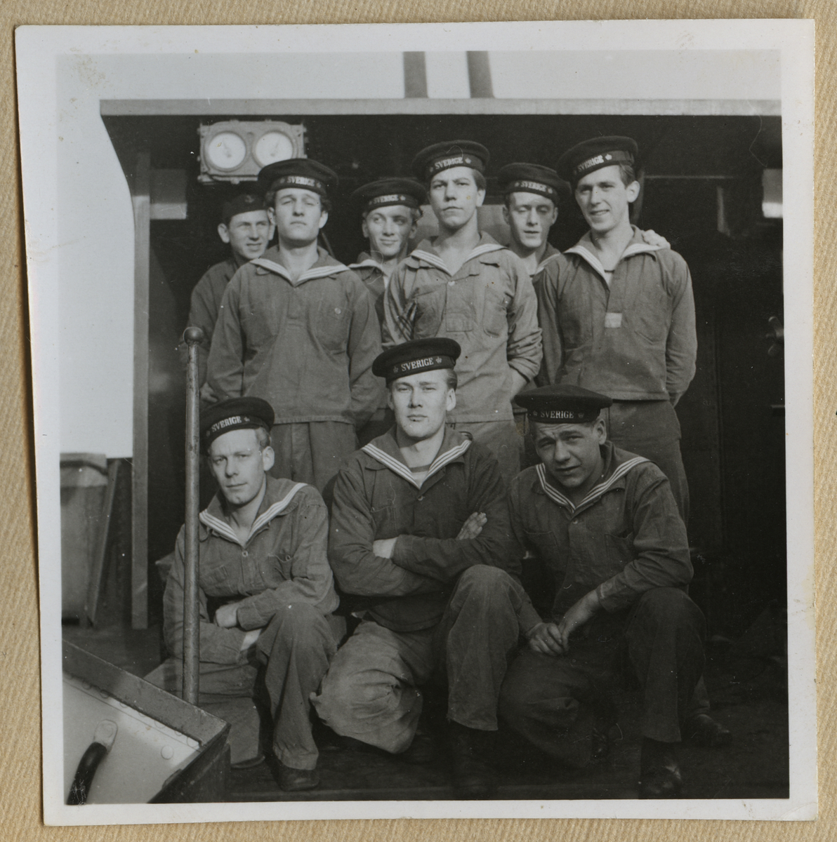 Nio stycken ekonomister har tagit uppställning för ett gruppfoto ombord på pansarskepp Sverige.