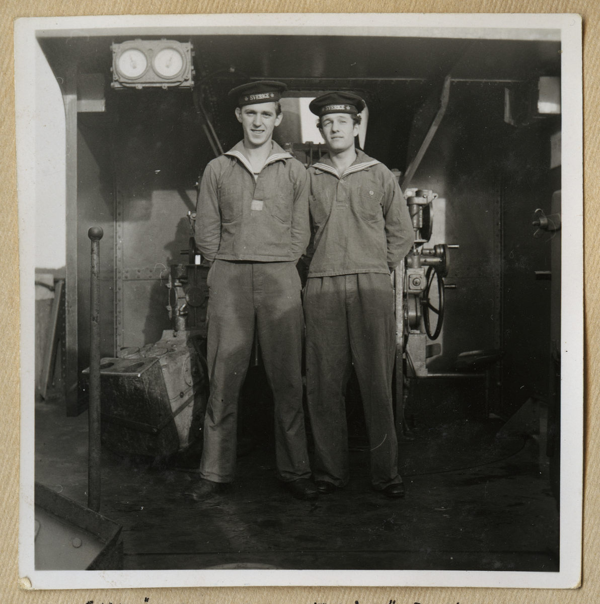 Porträtten visar två sjömän i arbetskläder ombord på pansarskepp Sverige.
