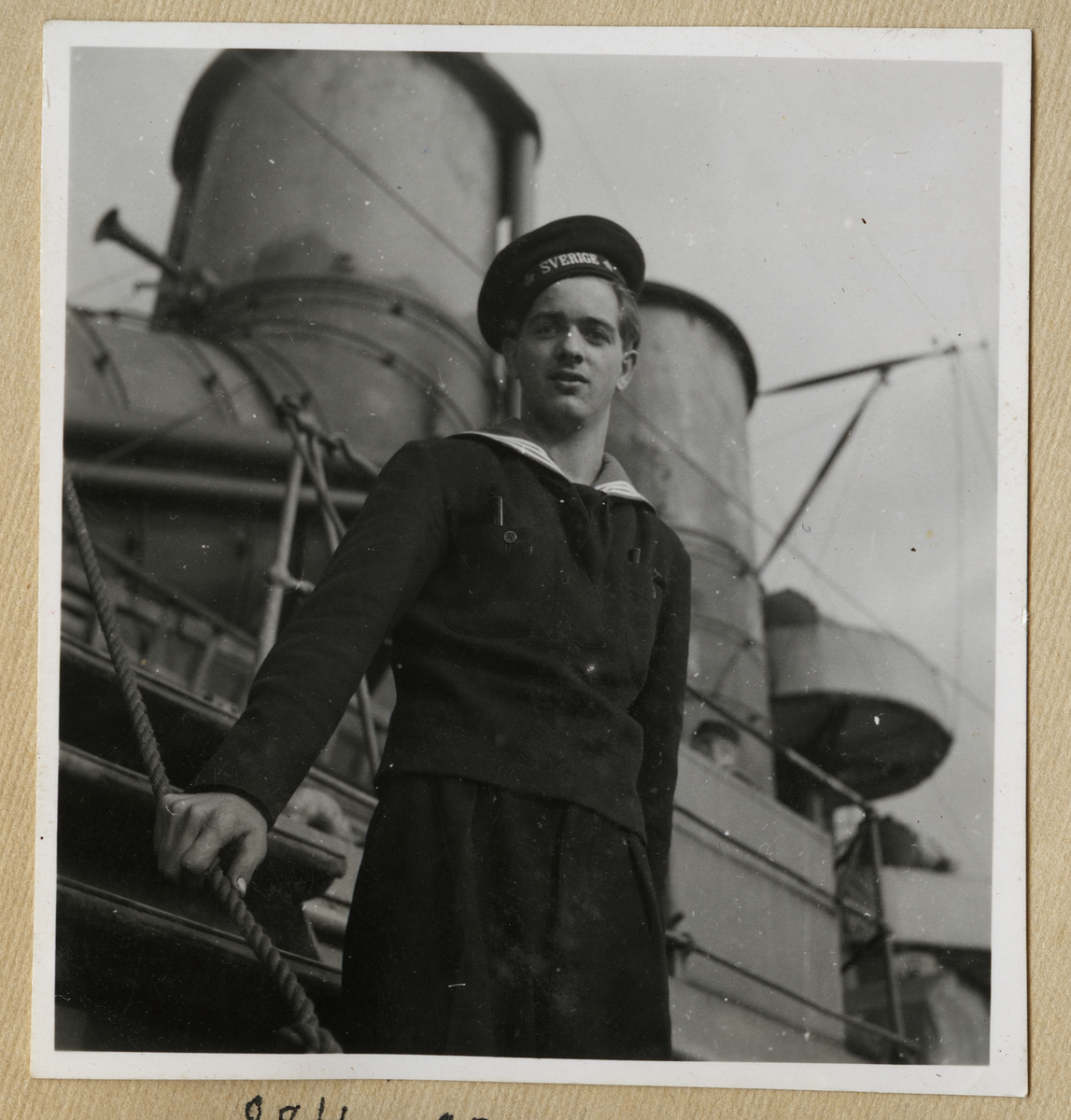 Sjöman 884 Carlsson har tagit uppställning för ett porträttfoto framför pansarskepp Sverige krökt skorsten.