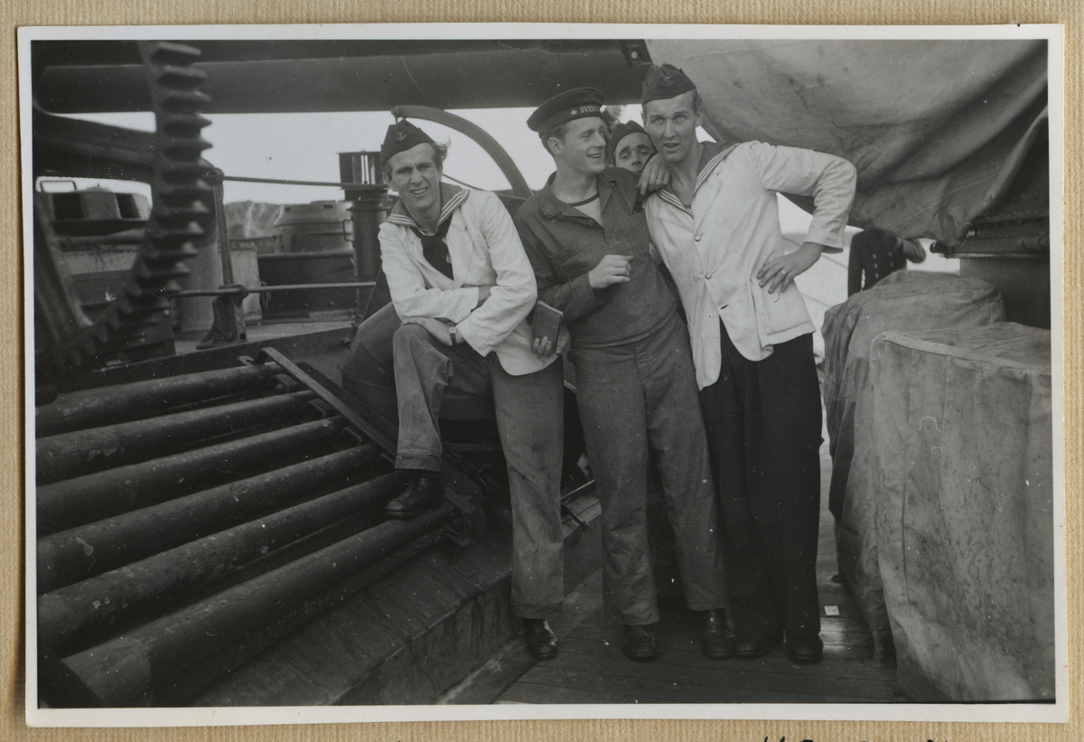 Bilden visar fyra sjömän som står under ett kanontorn på pansarskepp Sverige.