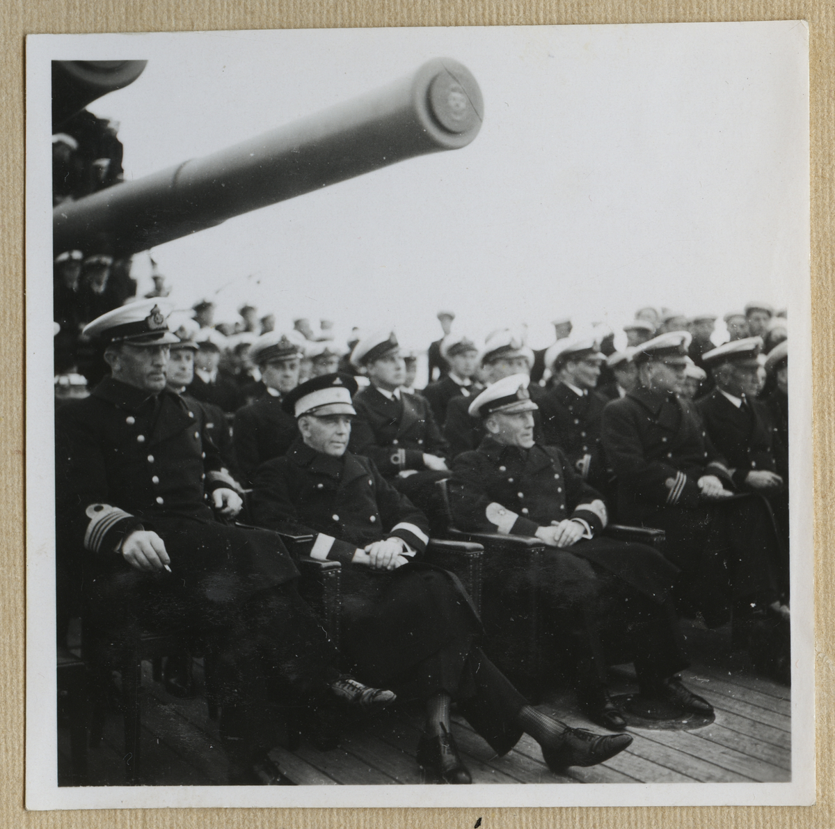 Bilden visar sjöofficerare och politiker som sitter ombord på pansarskepp Sverige och tittar på kabaré.