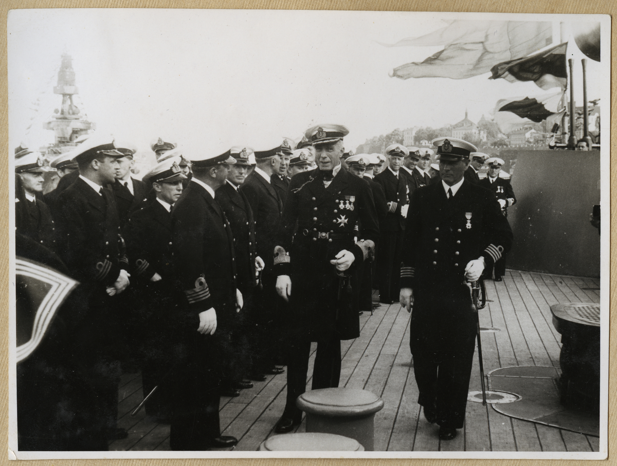 Bilden visar chefen för marinen Helge Strömbäck som går förbi hög sjöofficerare som har tagit uppställning ombord på pansarskepp Sverige.