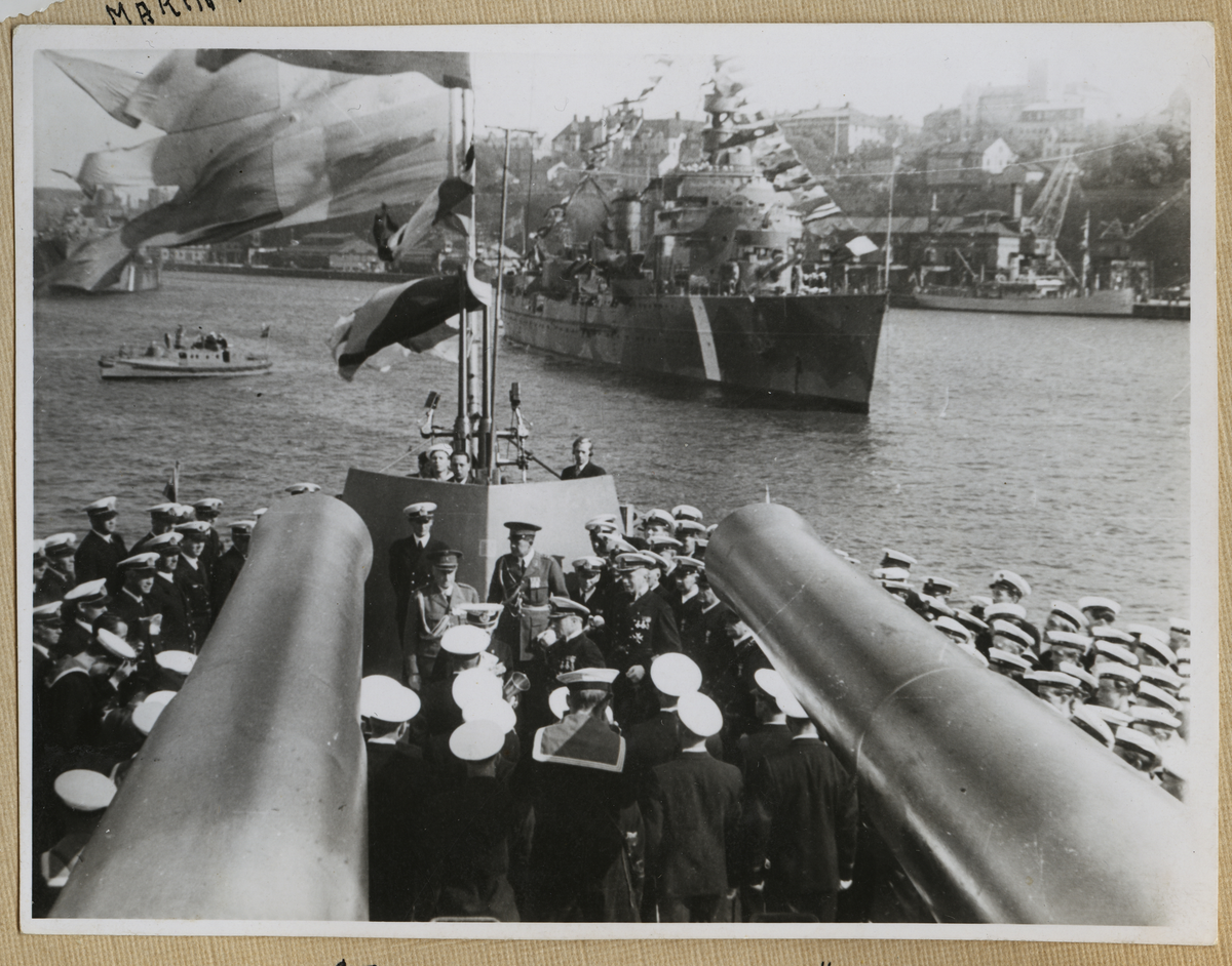 Bilden visar mottagandet av höga militärer på pansarskepp Sveriges akterdäck. Bakom fartyget ligger flera andra örlogsfartyg med neutralitetstecken och en barkass.
