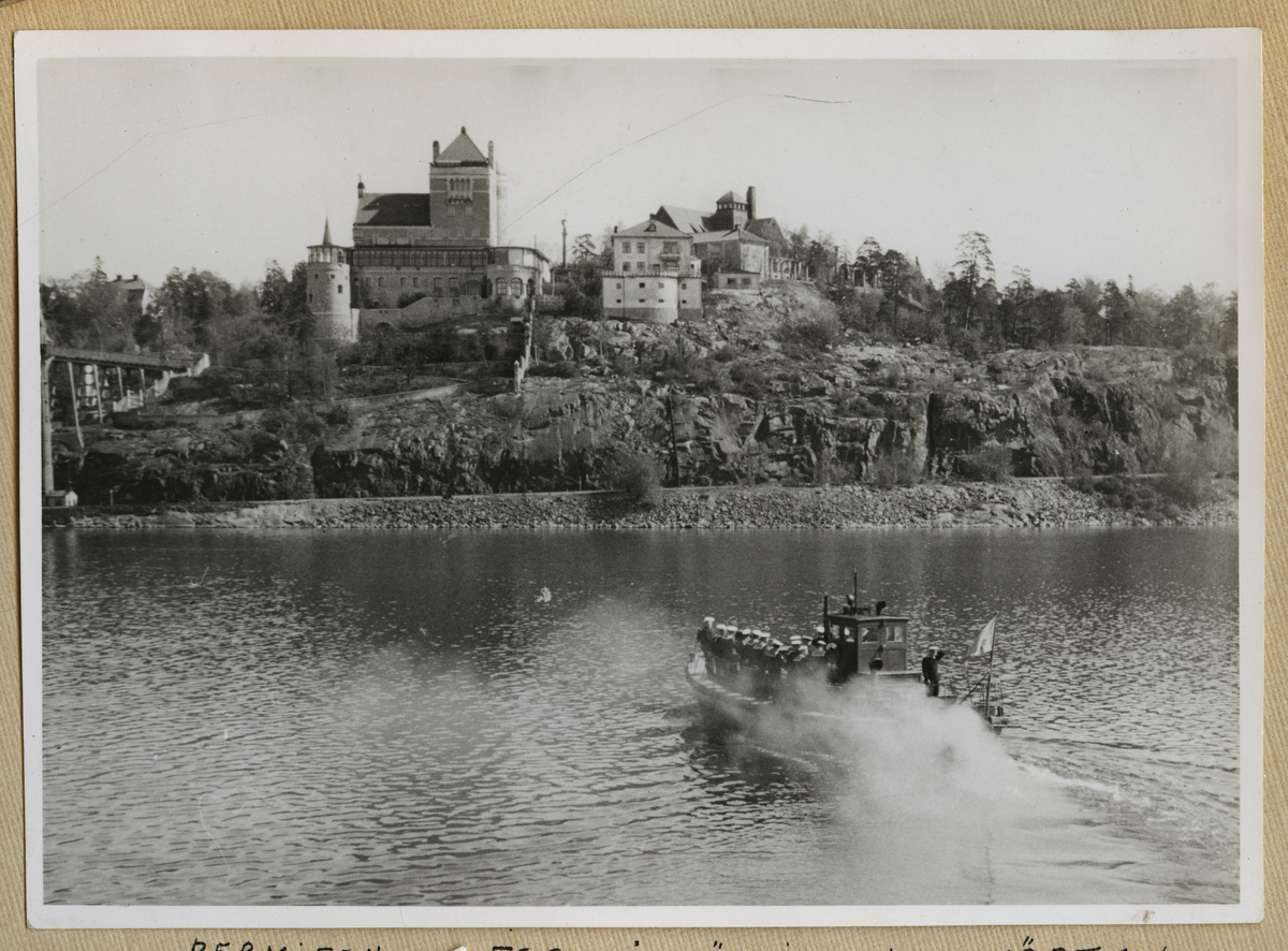 En grupp sjömän från pansarskepp Sverige sätter över till hotell Foresta med en barkass.