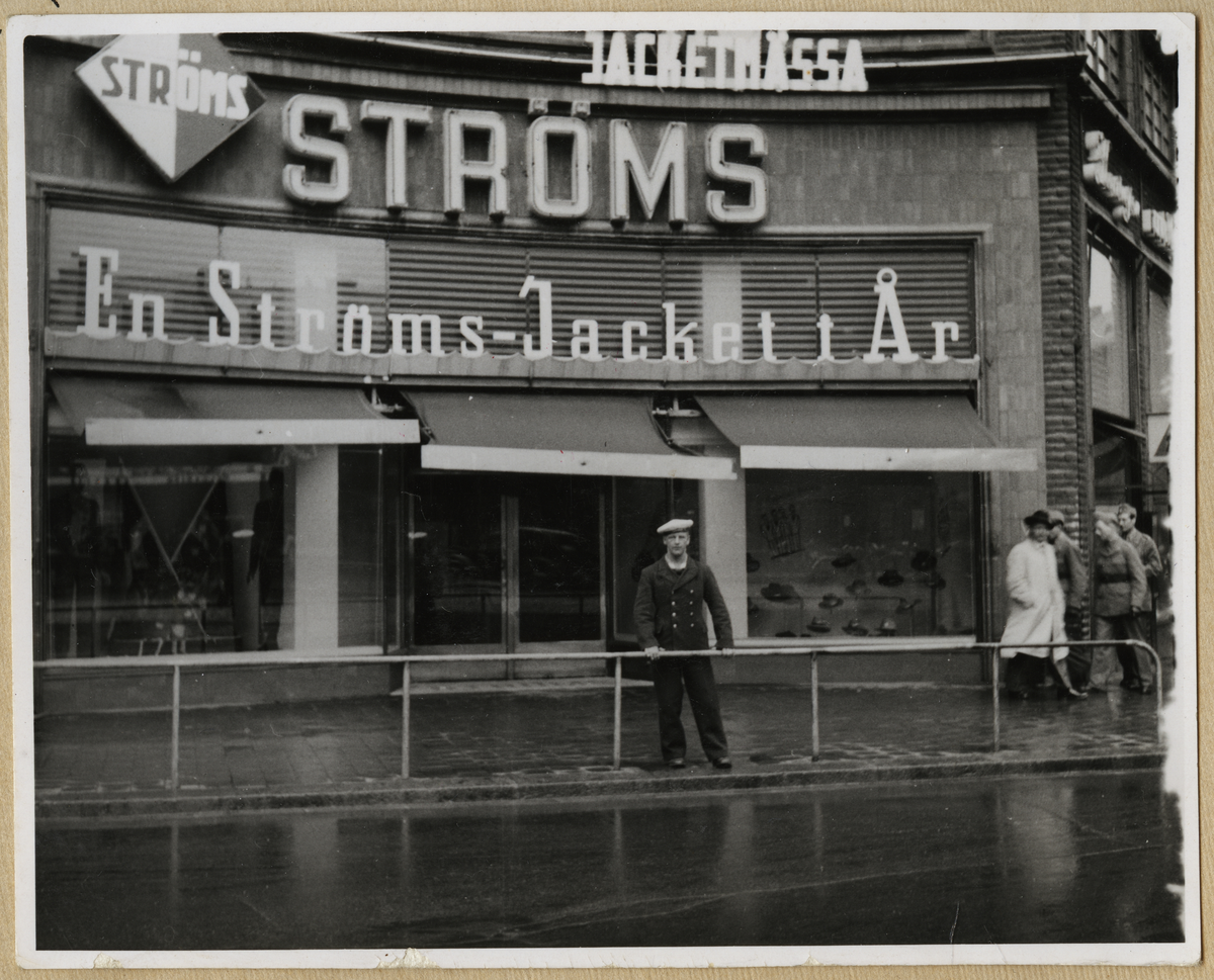 Bilden visar en sjöman från pansarskepp Sverige framför en butik i Stockholm.