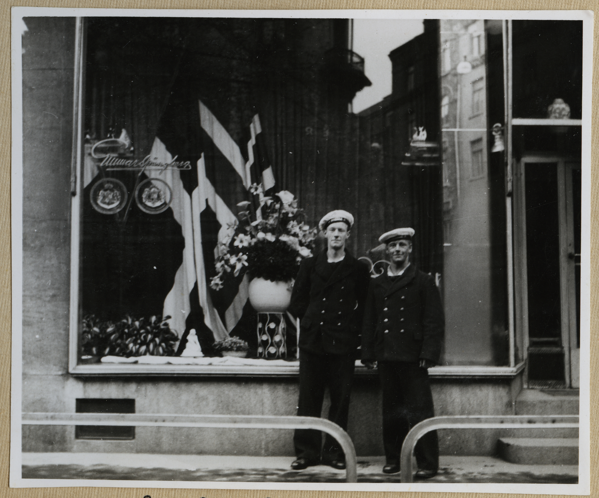 Bilden visar två sjömän från pansarskepp Sverige som står framför ett skyltfönster i Stockholm.